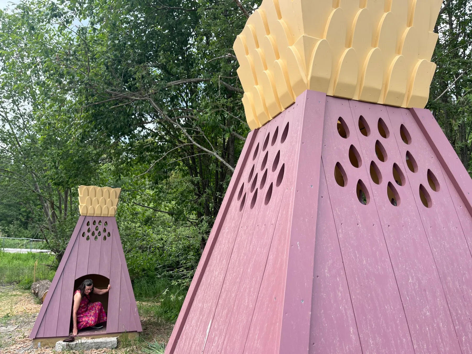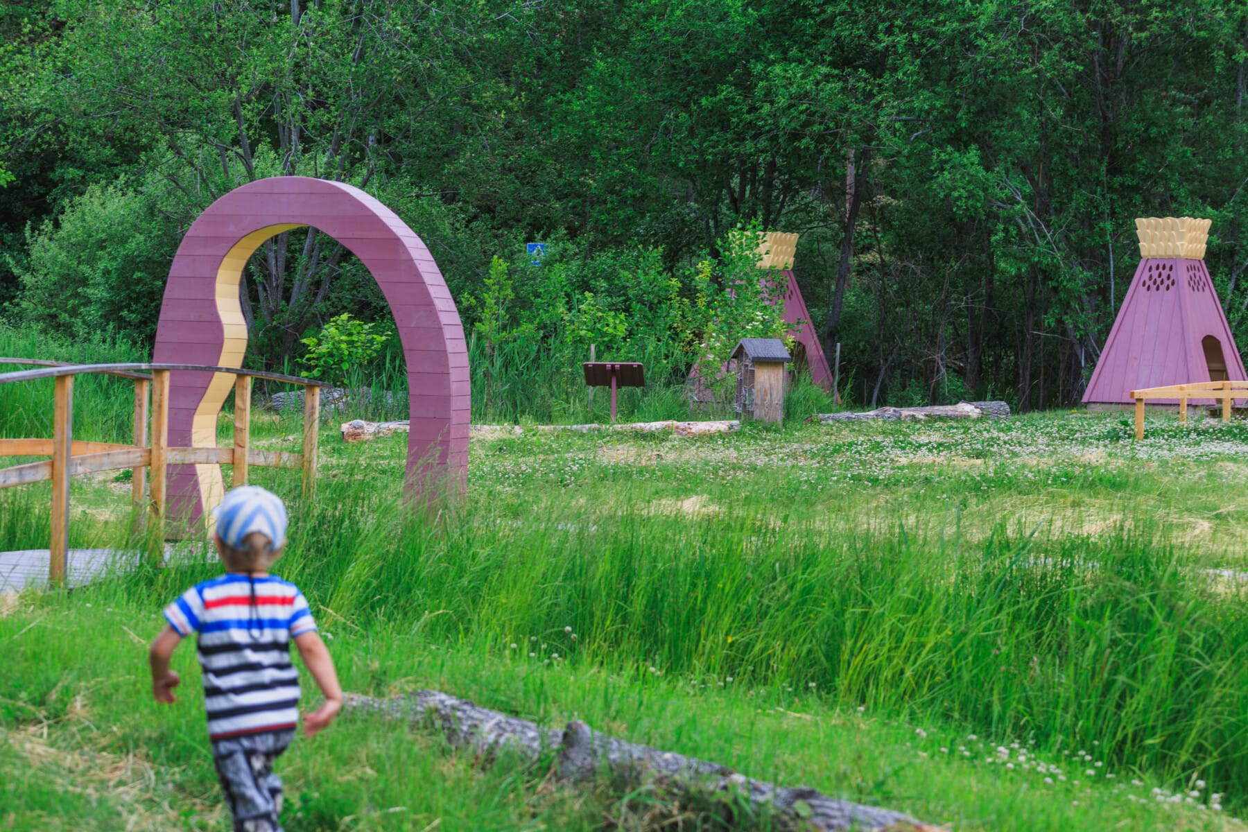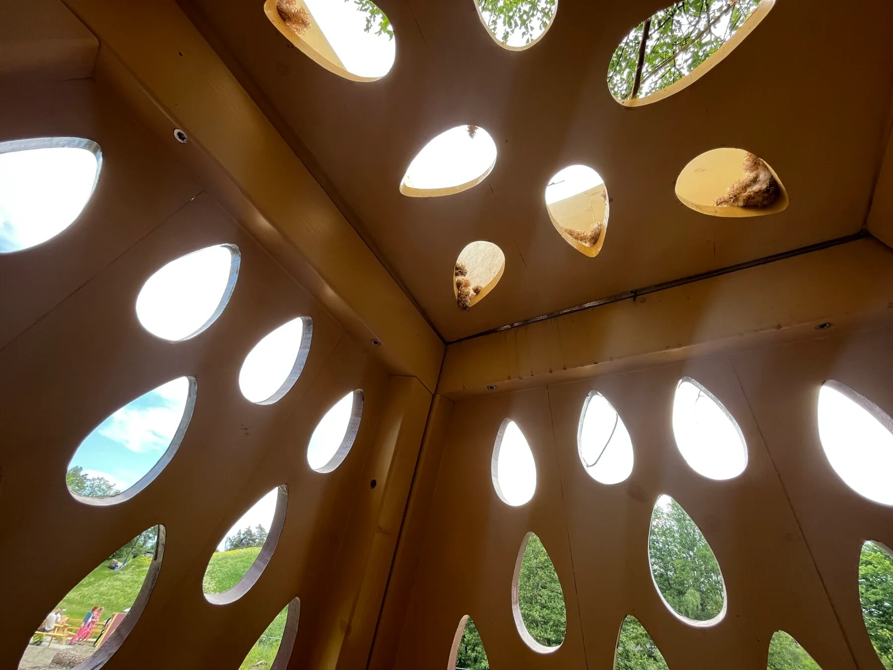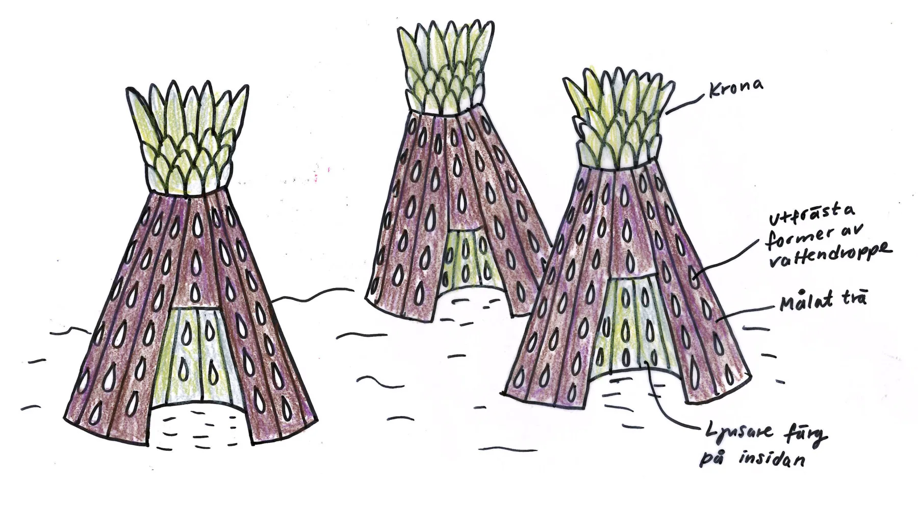 En portal och små sol- och vindkojor har också byggts i våtmarken. Mönstret av utsågade vattendroppar skapar ett fint ljusspel inne i ”älvkojorna” som har en krona högst upp och är målade i alarnas färg.