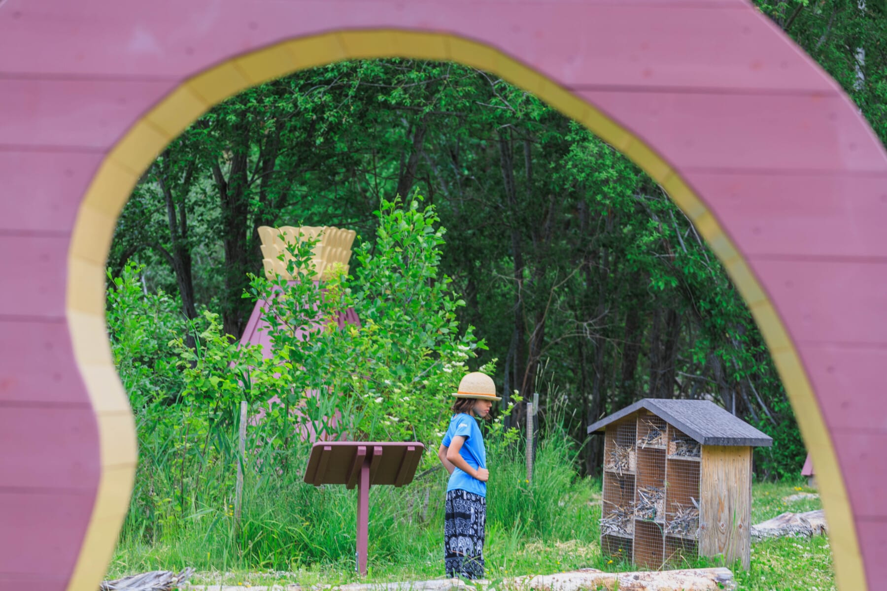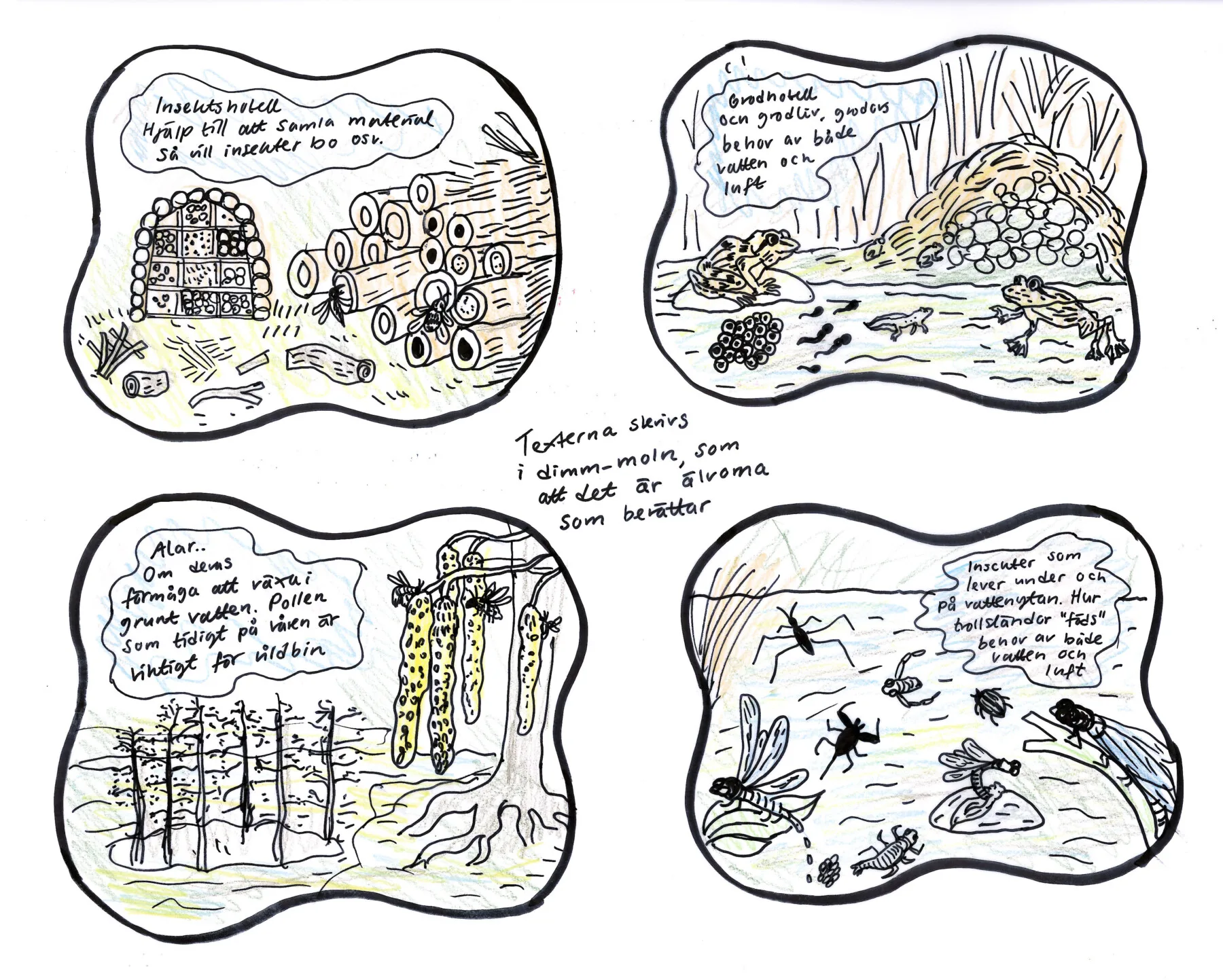 Kompletterande mindre infoskyltar skapar sagoinspirerade berättelser runt om i våtmarken. Älvorna är närvarande i skyltarna genom dimma och dis. Det är deras röst som berättar om insektshotellet, om hur grodor, alar och vattenlevande insekter behöver både vatten och luft, om hur de lever och hur de söker skydd från vintern.