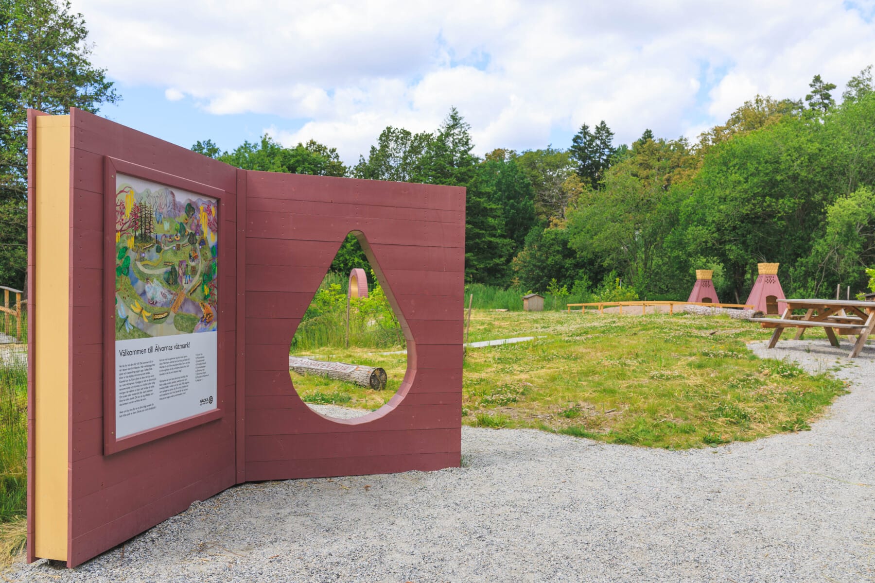 En välkomstskylt i form av en sagobok i jätteformat möter den som kommer fram till Älvornas våtmark. Den har ett hål i form av en stor vattendroppe som man kan klättra igenom för att ge besökaren upplevelsen av själv kliva in i boken. En introduktionsberättelse berättar om älvor och om våtmarken.