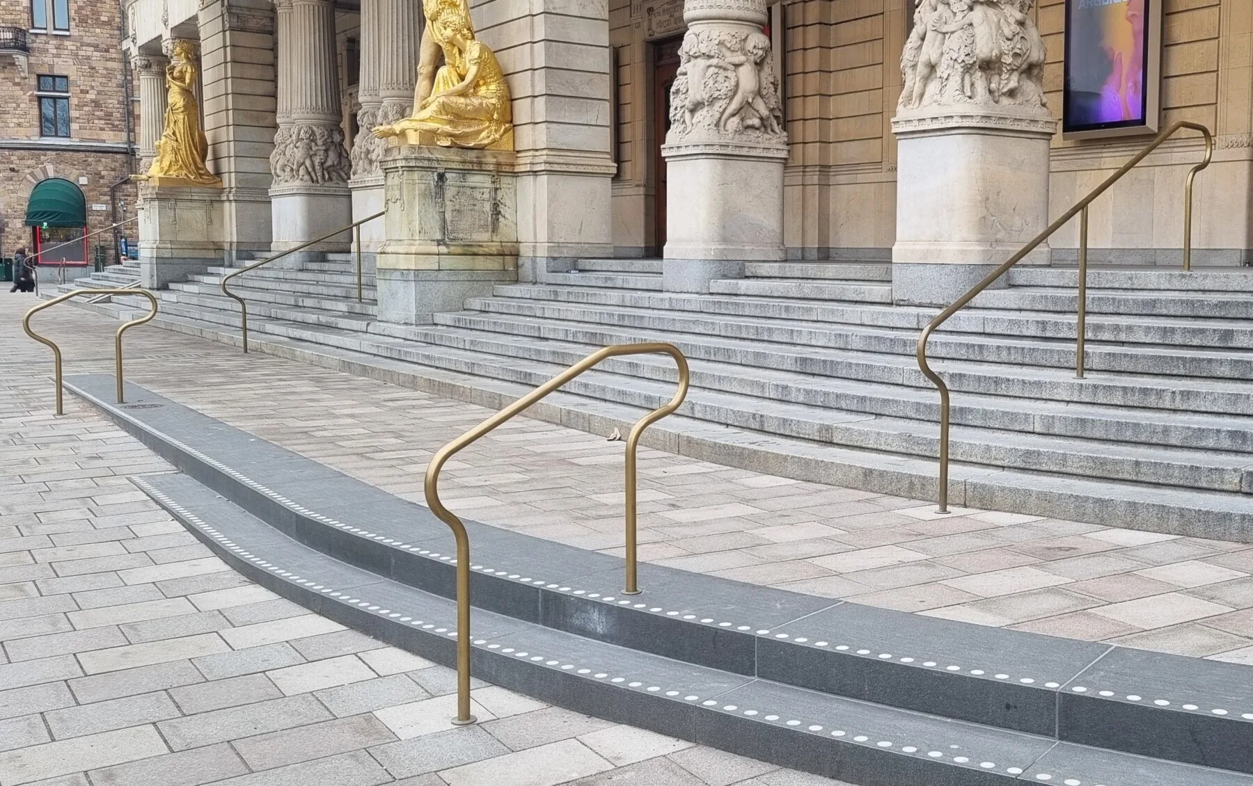 Tillsammans med Ahrbom & partner har vi på Landskapslaget förbättrat tillgängligheten till Dramatens entré. I samband med att en hiss skulle installeras i den befintliga trappan behövde markbeläggning och lutningar framför trappan göras om.