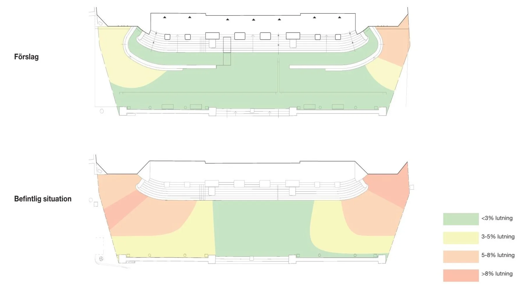 Vi har ritat på en lösning som förhåller sig till den ursprungliga utformningen från sekelskiftet där Dramatentrappan omgavs av en trottoar, men tillgodoser dagens krav på förbättrad tillgänglighet. En viktig del i projektet har varit att förstärka platsens funktion som vistelse- och mötesplats för stockholmarna och utforma en markbeläggning av hög kvalitet som åldras med värdighet.