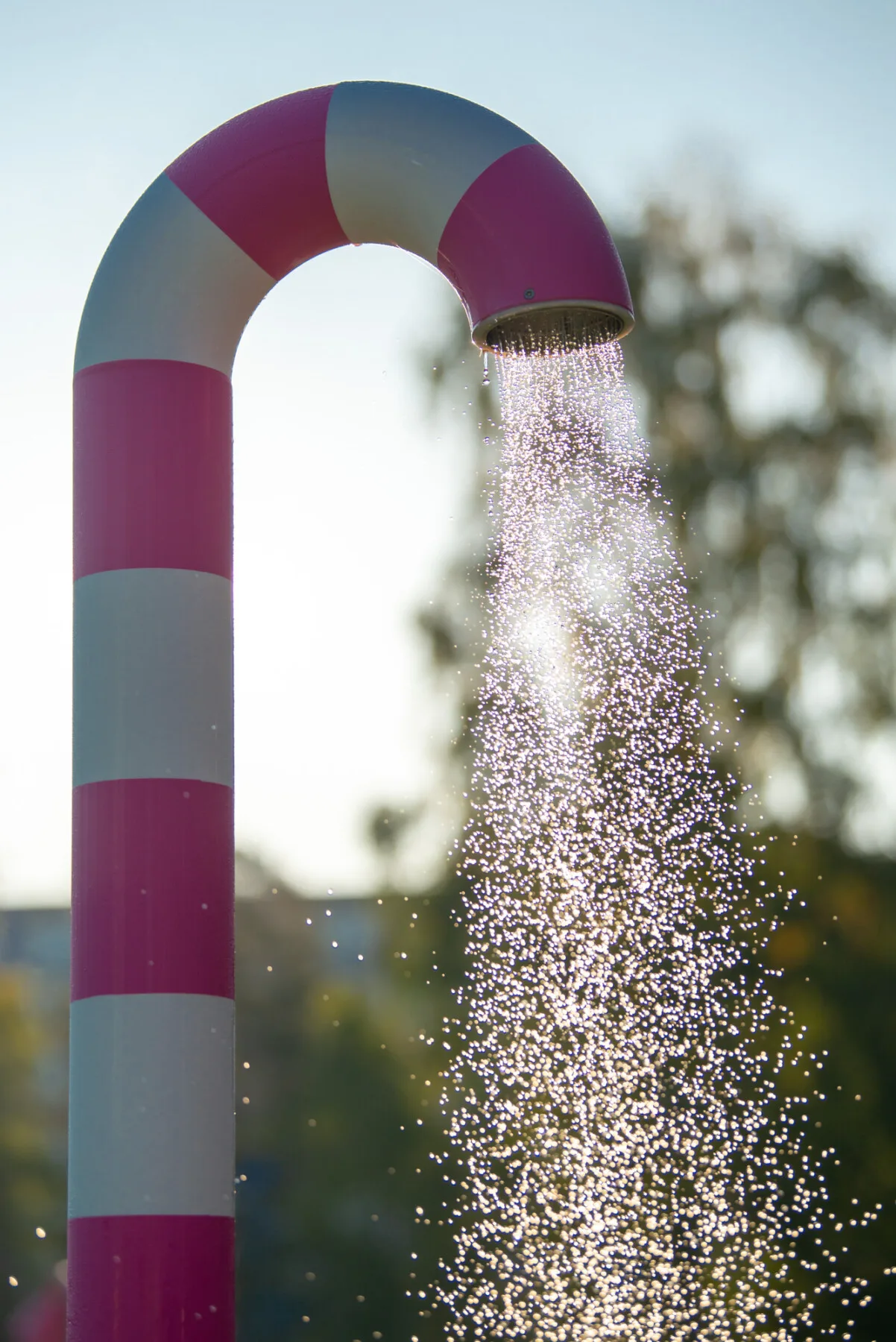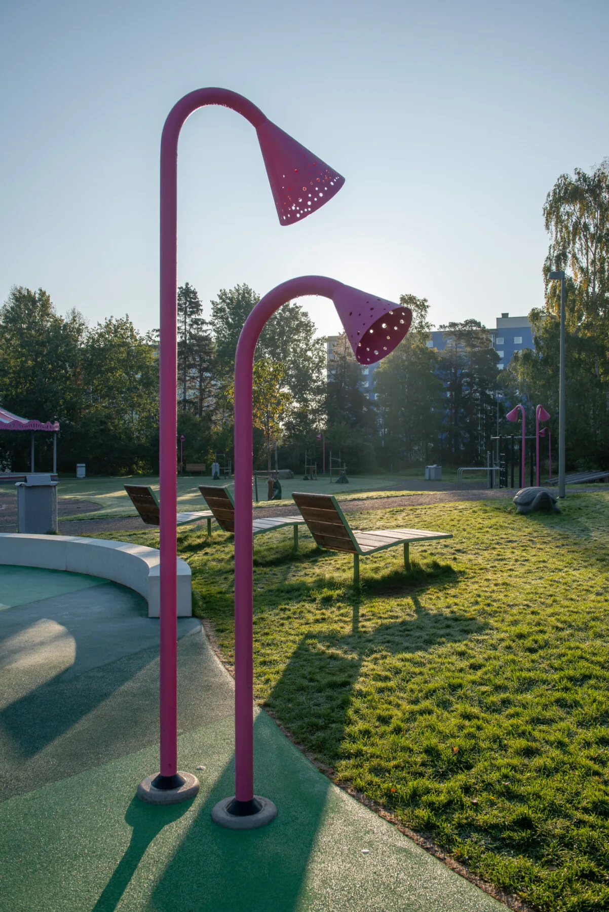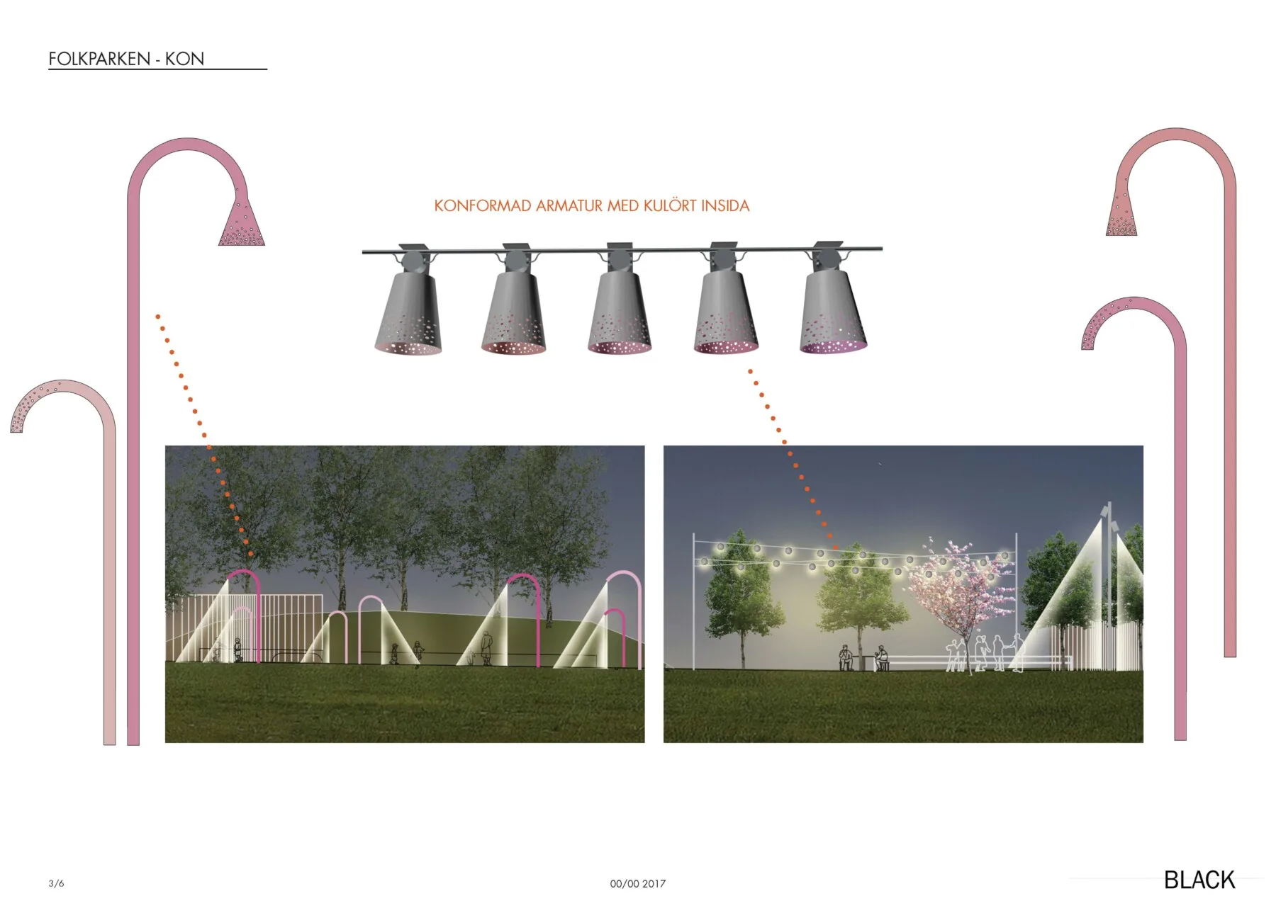 I samarbete med BLACK ljusdesign togs en lekfull belysning fram. Denna består av stolpar där man kan ”solduscha” och ett tak av lyktor ovanför parktorget som även det refererar till nöjesparken.