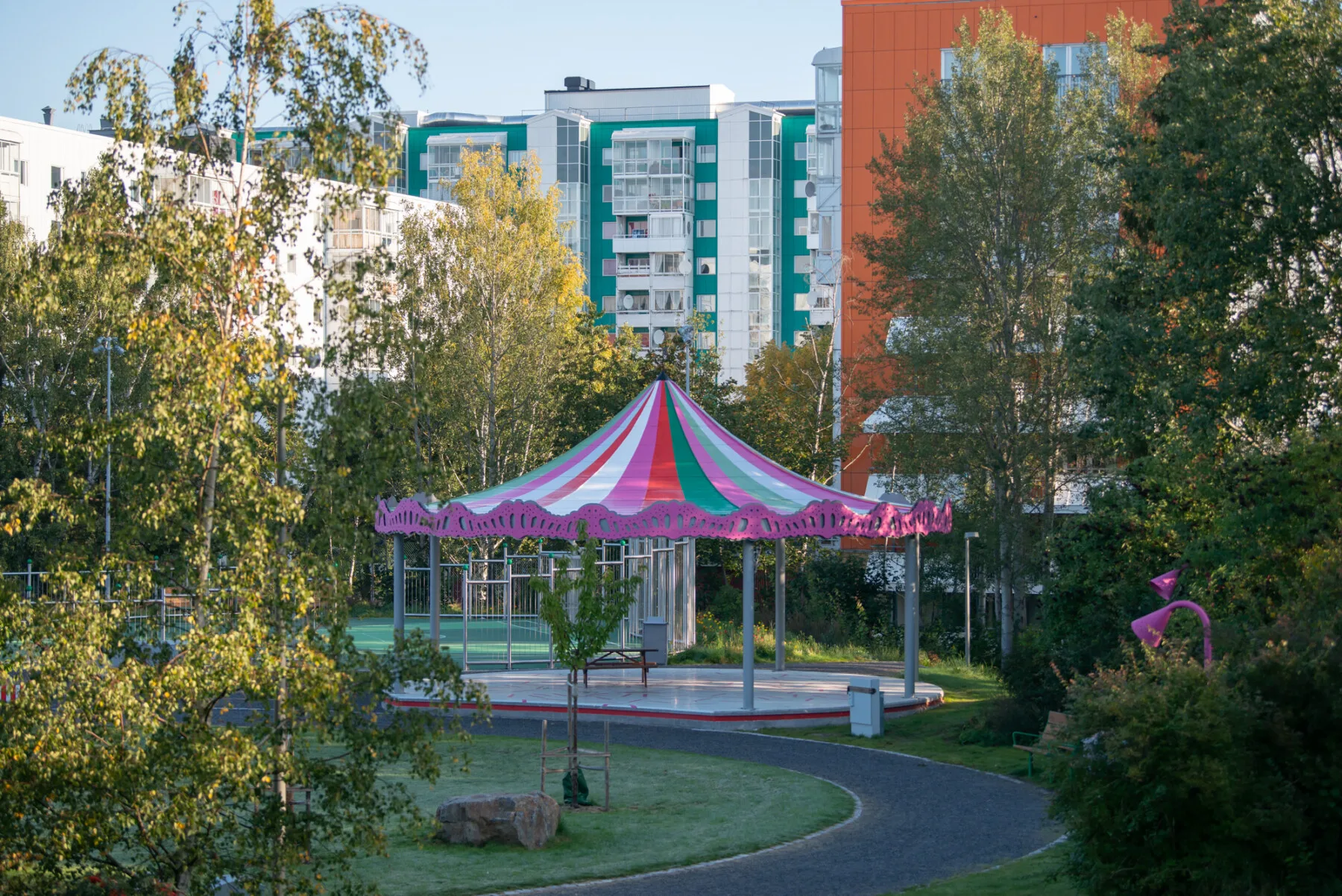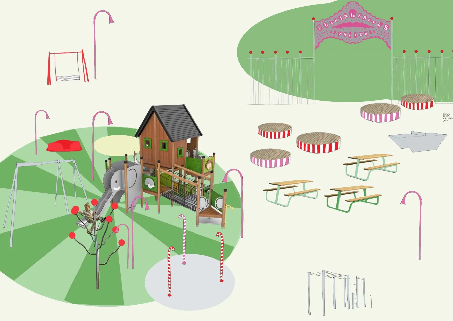 Tillsammans med konstnären Linda Bäckström togs skulpturala element i form av en scen och en skylt fram som anknöt till konceptet nöjespark. Scentakets form hämtar inspiration från karusellen och scenens golv från en glass med strössel. Multisportplanen som har en central plats i parken fick en identitetsstark skylt och utformades i en lekfull böljande form med ”transparenta” väggar och ”hängplatser” intill.