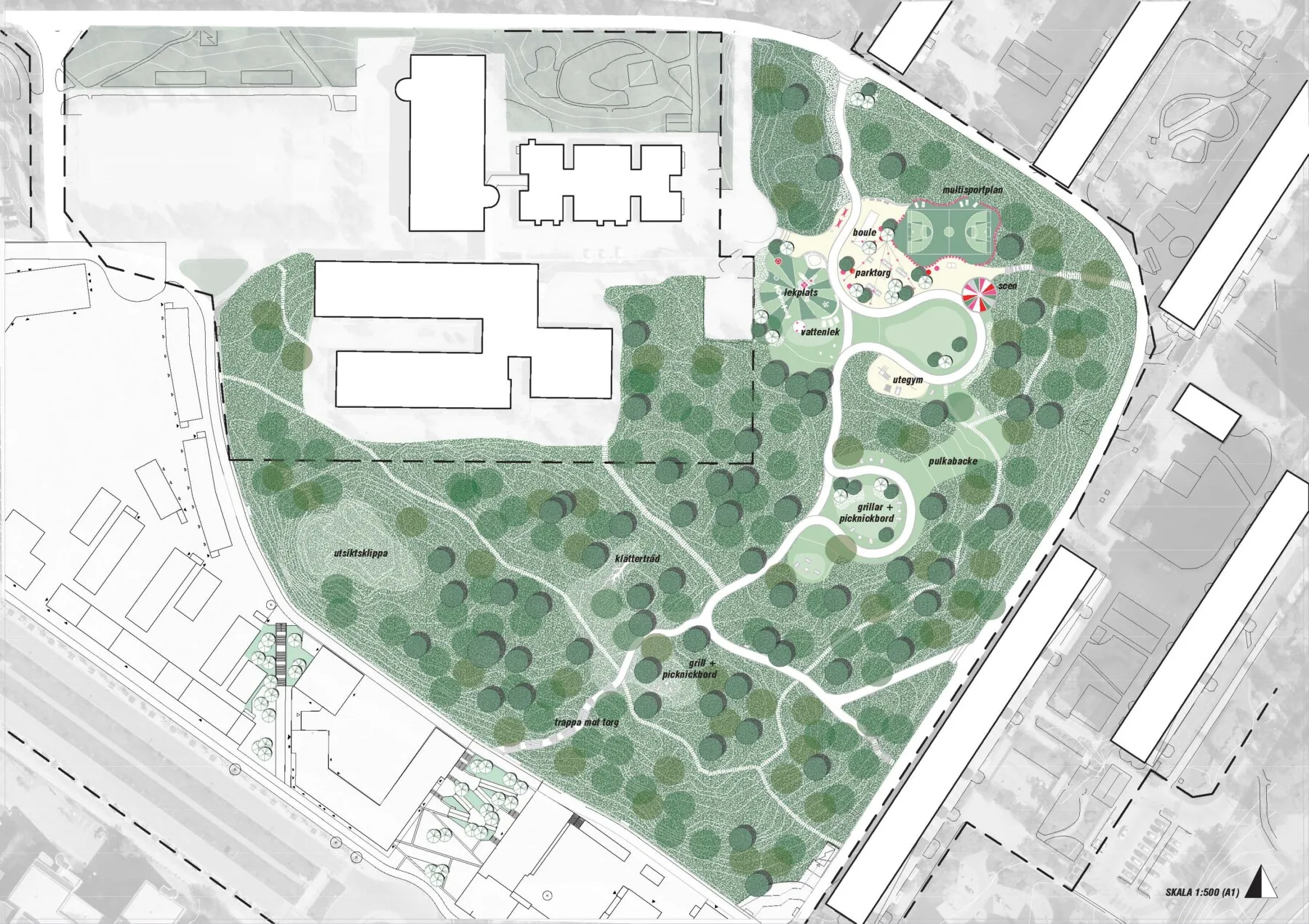 Eftersom parken används som en förlängning av den egna bostaden och många i området blir kvar under sommaren arbetade vi med utgångspunkten att i en del av parken skapa en ny tids folkpark som möjliggör en mängd olika sociala aktiviteter. Ett parktorg med långbord, grillar, boulebana och en stor lekplats med duschar skapades. Intill finns en multisportplan, utegym, dansbana/scen, grillglänta och pulkabacke.