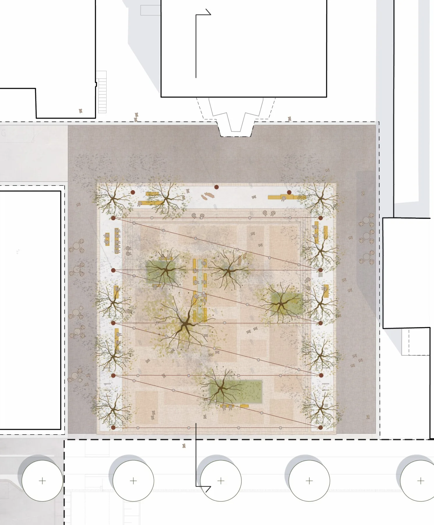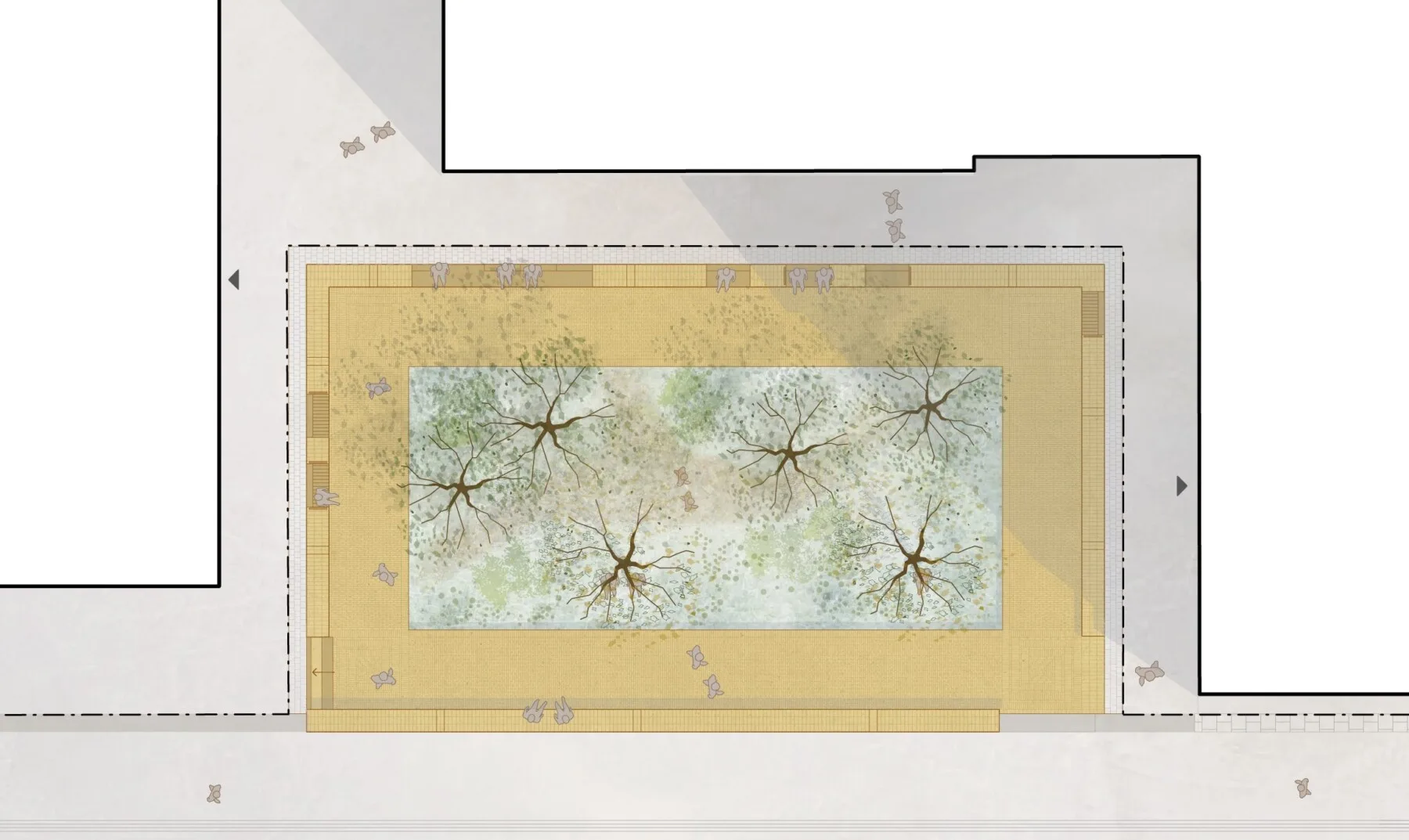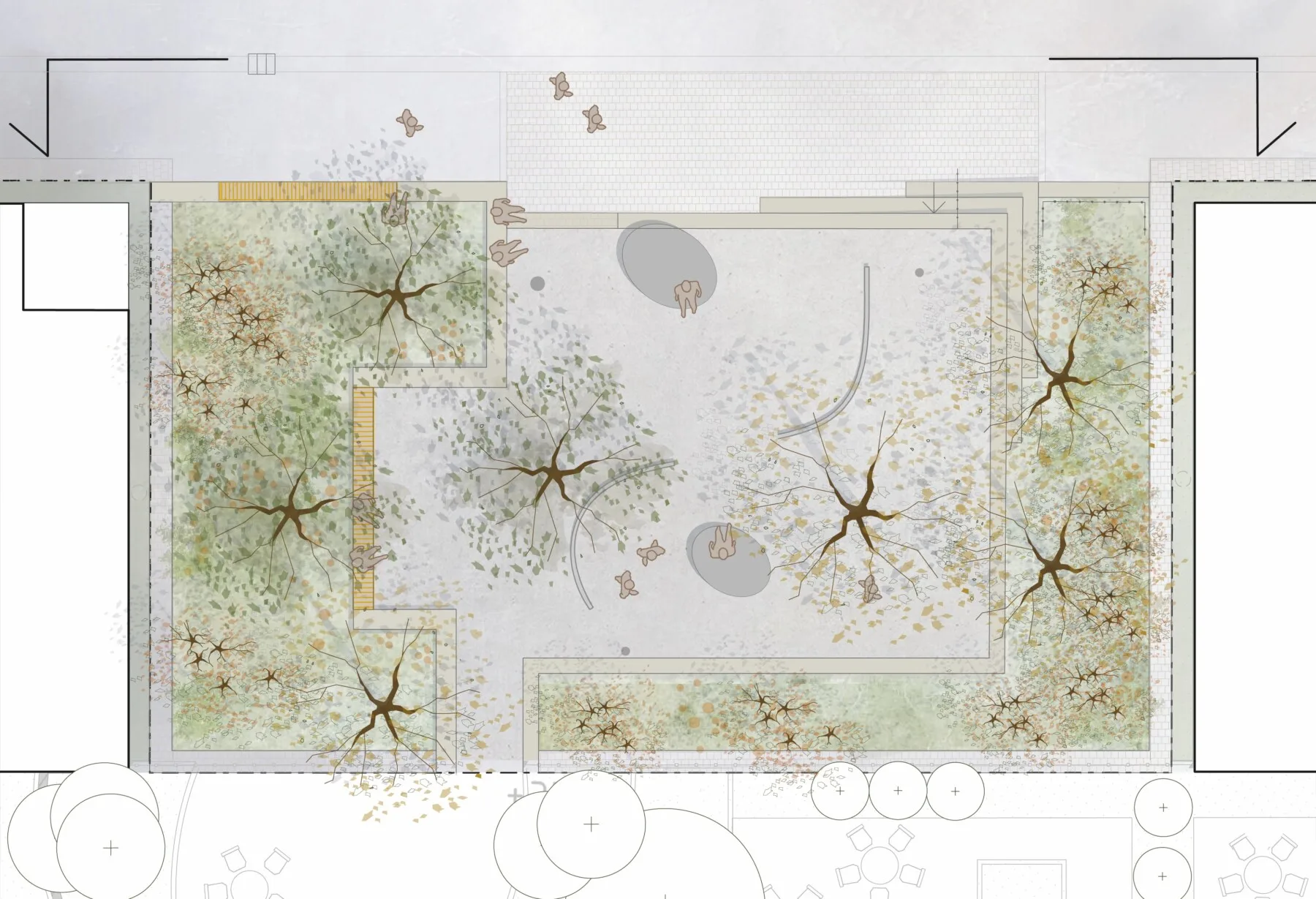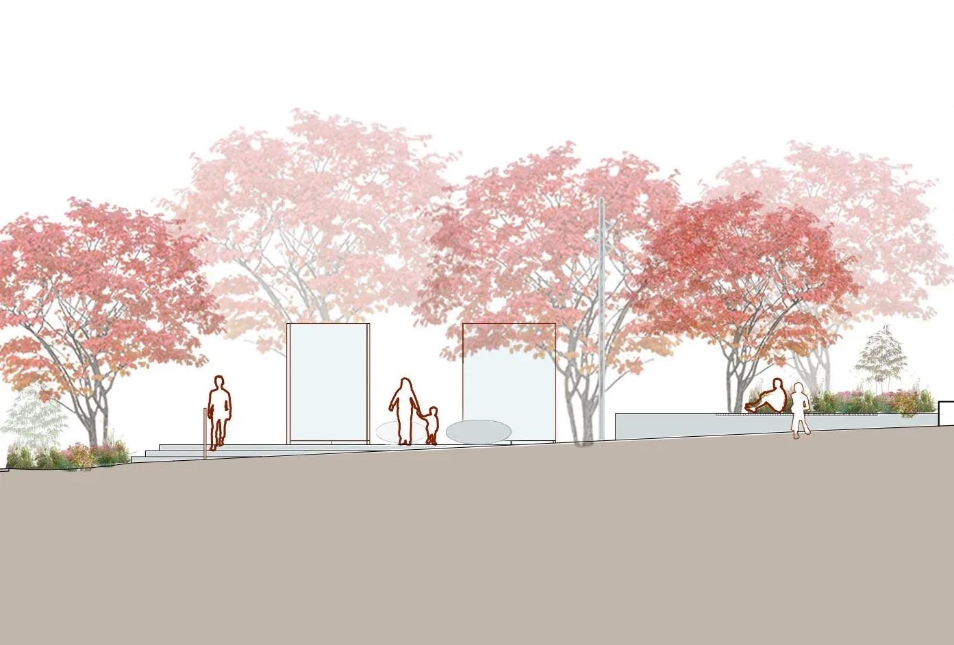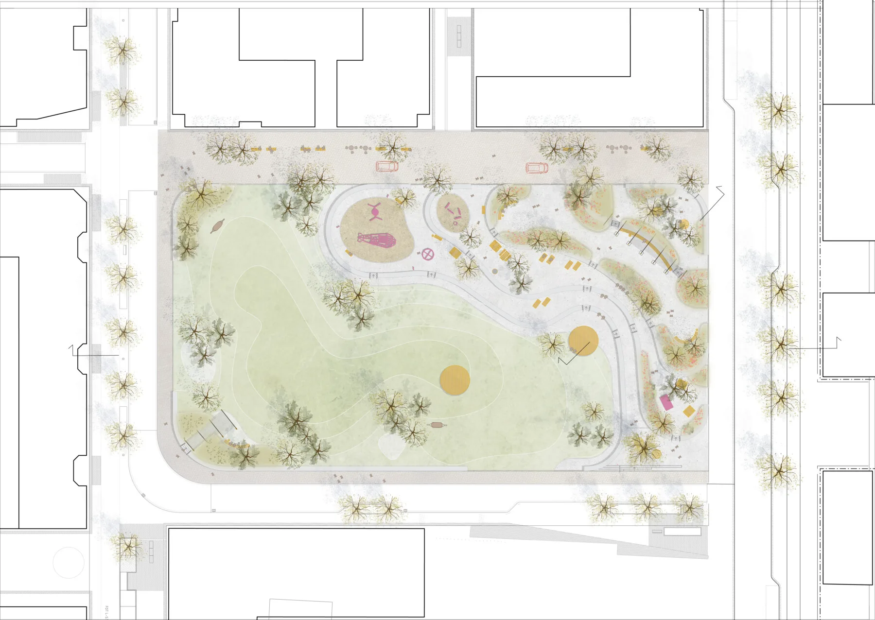Gestaltningen av fickparkerna utgår från de två teman som tilldelades i projektet: lekfull samt rofylld. I den lekfulla parken står två stora spegelväggar i fokus och växtmaterialet bidrar med mycket färg och form. I den rofyllda parken skapas ett intimt trädgårdsrum med en nedsänkt växtbädd som central matta och omgivande gröna väggar. Här går tonerna i lugna gröna och vita nyanser och vatten förstärker den rofyllda känslan.
